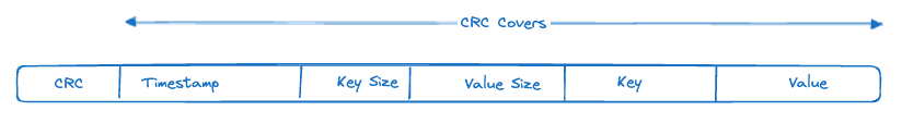 The first field is the Cyclic Redundancy Check (CRC). If you’re not familiar with CRCs they’re error-detection codes often used in networking and storage devices to detect accidental or erroneous changes to data. Bitcask uses CRCs for precisely this reason, to check on startup that a record is valid (i.e. it’s not a corrupt partial record created during a crash).