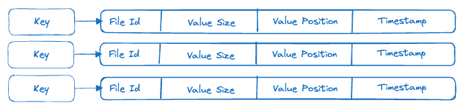 In this step your goal is to update the hash table to refer to the log file. When Bitcask does this it stores some metadata in the hash table instead of the value. That metadata looks like this: